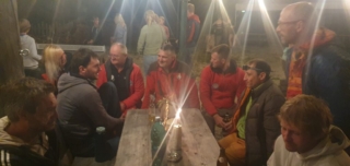 V soboto je bil dan plezanja, plezanja in plezanja. Popoldne se nas je večina dobila na pijači pod prelazom, kjer smo si izmenjali vtise, odšli v kamp in si pripravili večerjo. Po njej pa smo že začeli kovati načrte za naslednji dan: kaj in kako bomo plezali, kako učinkovito pospraviti bazo, logistiko s prevozi (roba ločeno, osebe ločeno) itd. Nato pa smo uživali v zgodbah iz preteklosti ter predstavi z ognjem, ki jo je pripravil kamp.